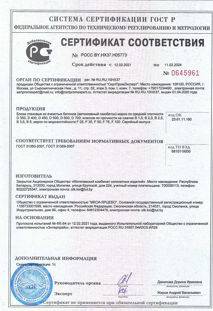 Марка прочности газобетонного блока указывает на его способность выдерживать нагрузки. Для газобетона Могилевский КСИ D400 эта марка составляет B2.5, что соответствует среднему уровню прочности.